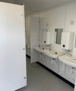 Inside, the cabin is equipped with a sealed vinyl floor and wipe-clean wall boards, making maintenance quick and easy. The insulated walls and ceiling provide comfort in various weather conditions. Each unit includes WC’s, basins, urinals, water heaters, fluorescent strip lighting, tubular heaters, and extractor fans, creating a fully functional, hygienic, and well-lit toilet facility.